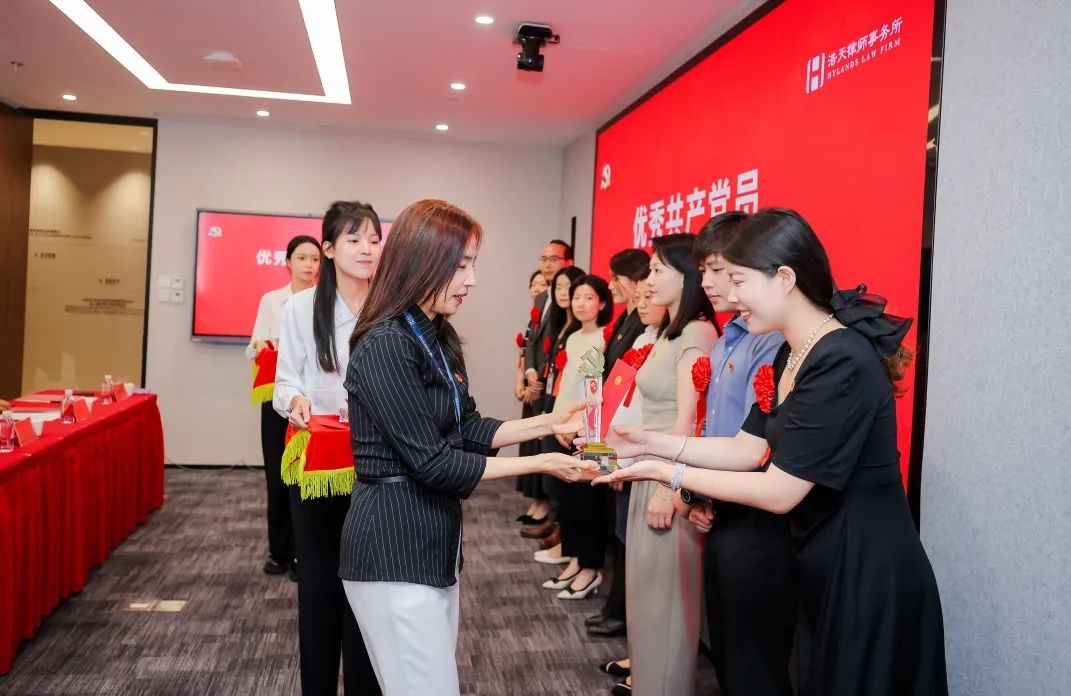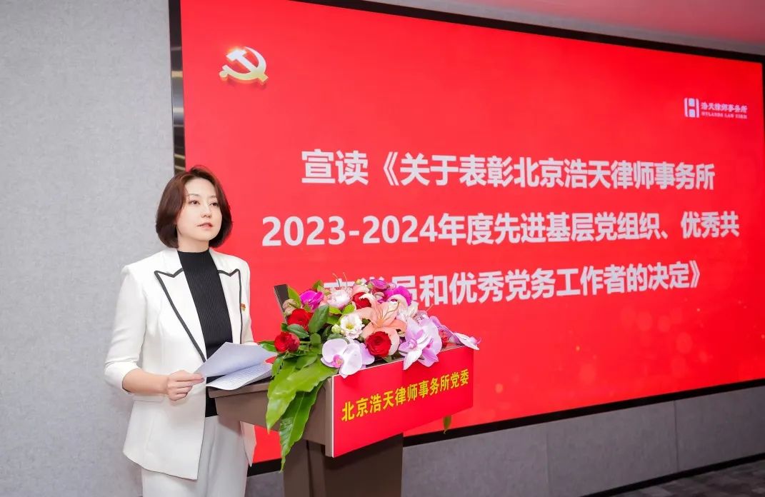 党委委员、管委会委员张淼同志宣读了《关于表彰北京浩天律师事务所2023-2024年度优秀共产党员、优秀党务工作者、先进基层党组织的决定》,授予于佳琪、王莺、王琦、卢琦、朱颖、任梦、刘玉萍、安晨曦、孙一童、孙得馨、李丹、李剑桥、吴梦瑶、何云凤、张金栋、张萌萌、胡古、赵阳、姜山赫、高庆超、董龙凤、蒋文捷、薛海莎、魏中华等24名同志为优秀共产党员称号;授予于谨源、王静、王艺霖、乐蓁楠、刘洋、李妍、邱梅、张樱山、霍韩琦等9名同志为优秀党务工作者称号;授予第二党支部、第五党支部、第六党支部、联合党支部为先进党支部称号。