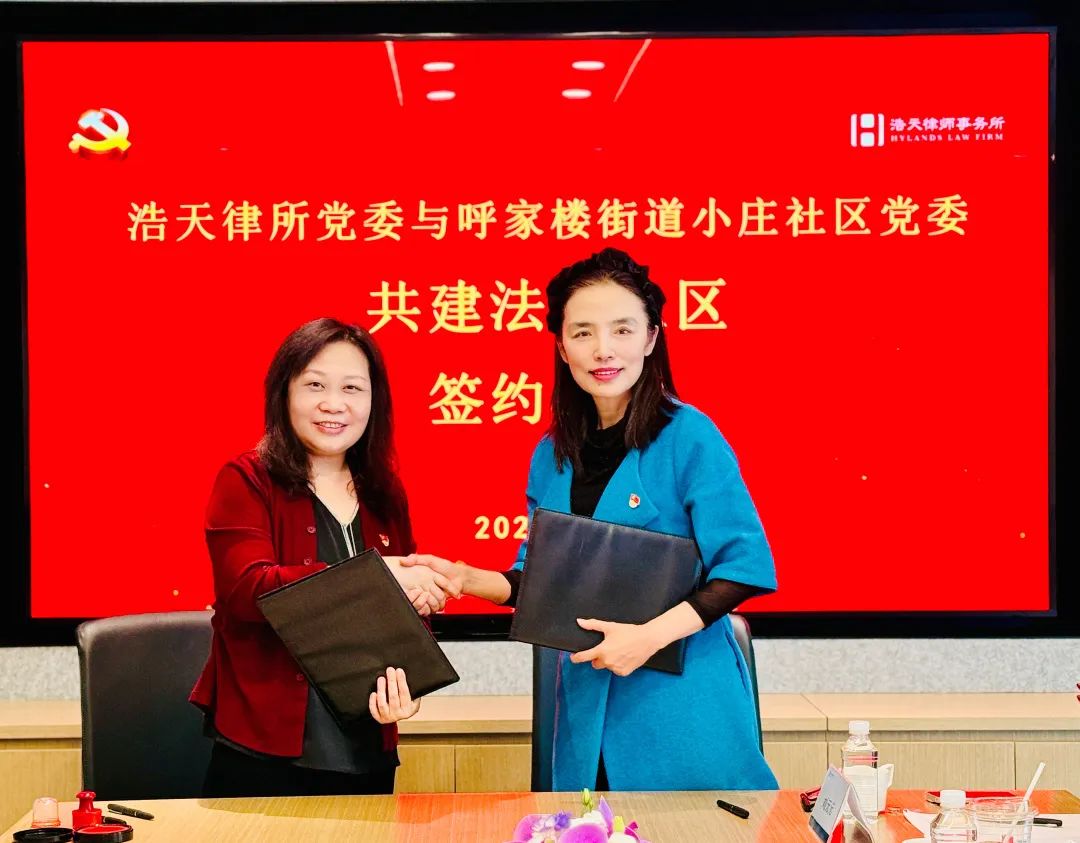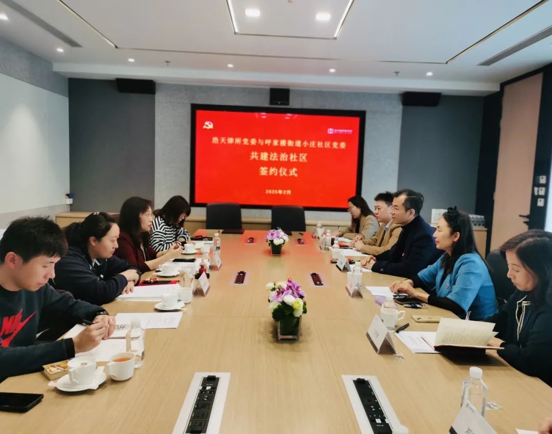 为进一步深入贯彻习近平法治思想,践行“做党和人民满意的好律师”,通过律师事务所党组织与社区党组织“组织结对子、党群手拉手”的工作方式,全面推进建设法治社区,打造共治、共建、共享的社会治理新格局,根据朝阳区律师行业党委的安排,目前浩天党委及八个所属党支部与相关社区的法治共建工作已正式启动。2025年2月24日,北京浩天律师事务所党委和北京市朝阳区呼家楼街道小庄社区党委在浩天律师事务所举行了“共建法治设区”签约仪式暨法律公益服务座谈会。浩天党委副书记邱梅,浩天律所公益委员会副主任、联合党支部书记于谨源,第二党支部委员、律师万昕,第四党支部律师刘元元,第五党支部律师刘南希,党办及行政部门主要负责人参加了会议。小庄社区党委书记、居委会主任赵婧玮,副书记裴玉宏及部分社工参见了会议。