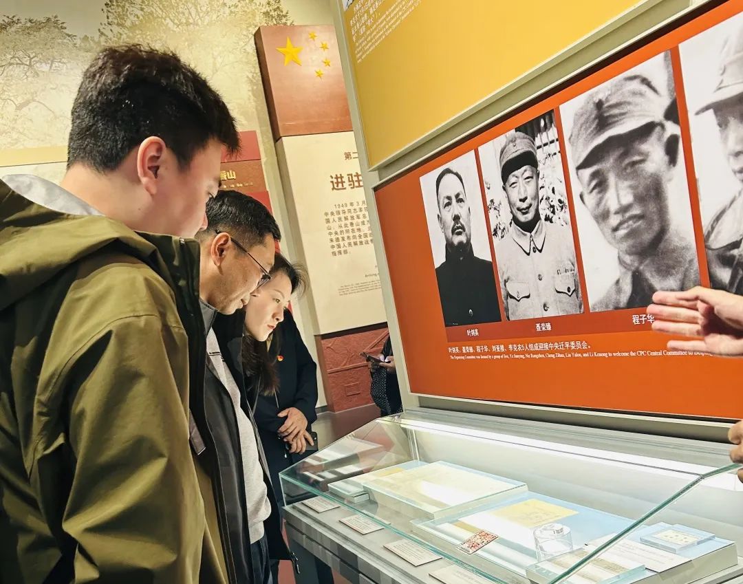 大家认真聆听讲解,仔细观看纪念馆的实物和展柜里的各种历史资料。泛黄的《论人民民主专政》手稿,修改痕迹如战地壕沟般纵横交错。透过放大镜观察,可见"人民"二字被反复圈画,墨迹层层晕染,执政理念经过淬火愈发清晰。这份修改了27稿的纲领性文件,彰显着共产党人"精益求精"的执政品格。