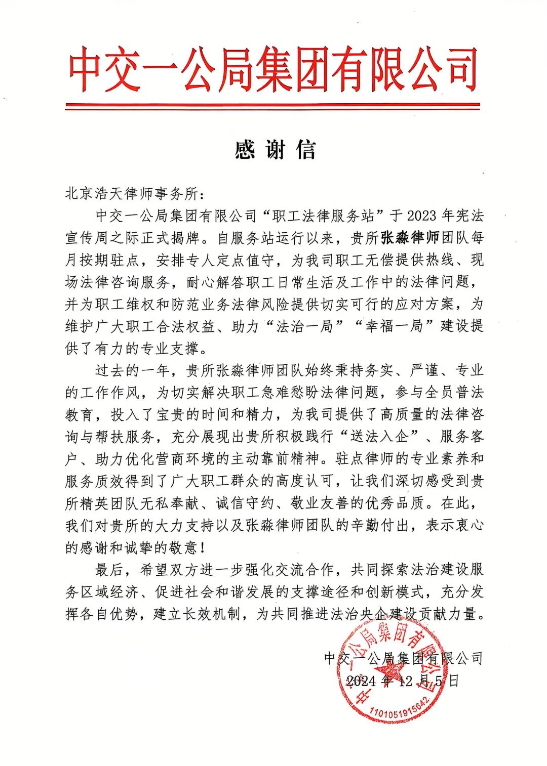 2024年12月5日,中交一公局集团组织开展“职工法律服务站”开放日暨宪法宣传周交流座谈会。北京浩天律师事务所张淼律师团队受邀参加活动。中交一公局总法律顾问、首席合规官许恩信主持会议,全面总结公司职工法律服务站过去一年运行情况,现场宣读并为驻点律所律师代表赠送了感谢信。