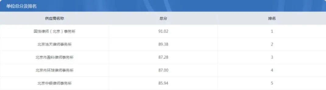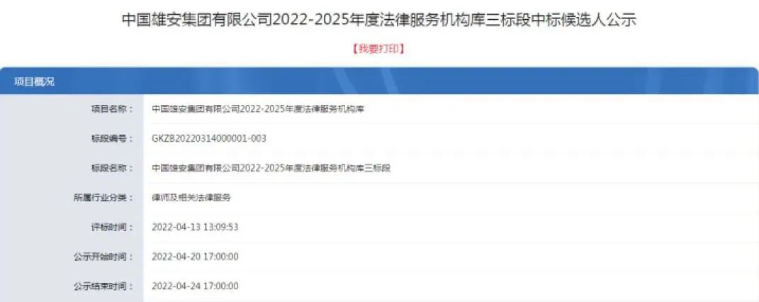 近日,中国雄安集团有限公司法律服务机构入库项目评标结果在中国雄安集团电子招标采购交易平台上正式公布,北京浩天律师事务所投出的三个标段全部中标。中标标段分别为:01公司商事和城市运营、03金融、07诉讼及纠纷处理。