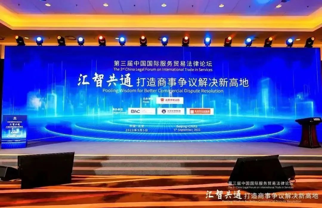 2023年9月5日下午,由北京市司法局主办,北京仲裁委员会、北京市律师协会、北京市公证协会共同承办的“第三届中国国际服务贸易法律论坛”在国家会议中心举办。司法部公共法律服务管理局一级巡视员孙春英出席论坛并致辞。北京市政府副秘书长尹航主持开幕式。