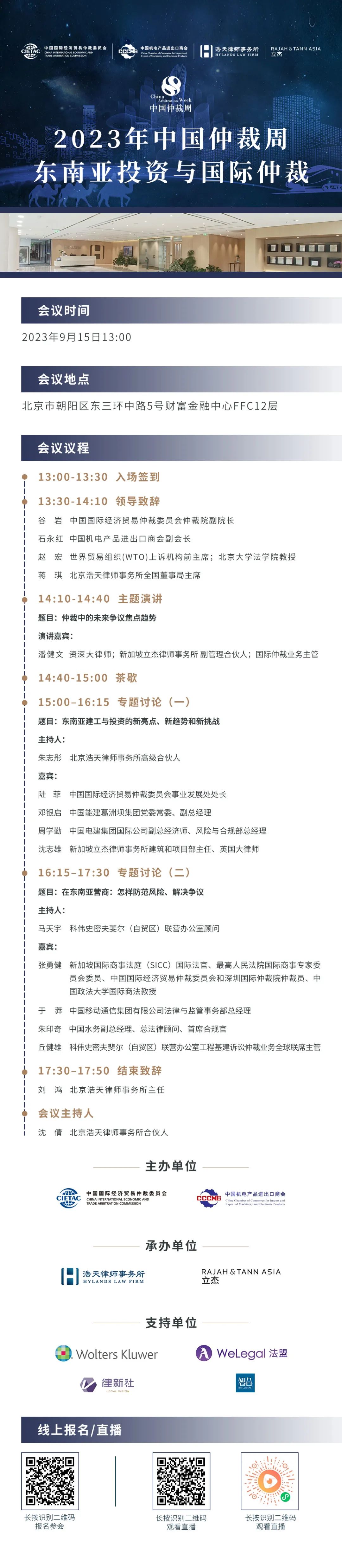 “2023中国仲裁周·东南亚投资与国际仲裁”研讨会将于2023年9月15日周五下午在北京浩天律师事务所召开。本次活动由中国国际经济贸易仲裁委员会、中国机电产品进出口商会联合主办,北京浩天律师事务所、新加坡立杰律师事务所共同承办,邀请国内外知名仲裁法律专家、学者、企业法总等,立足多元视角讨论东南亚项目投资的热点问题,共同交流分享项目投资国际仲裁的前沿理论与实务经验。