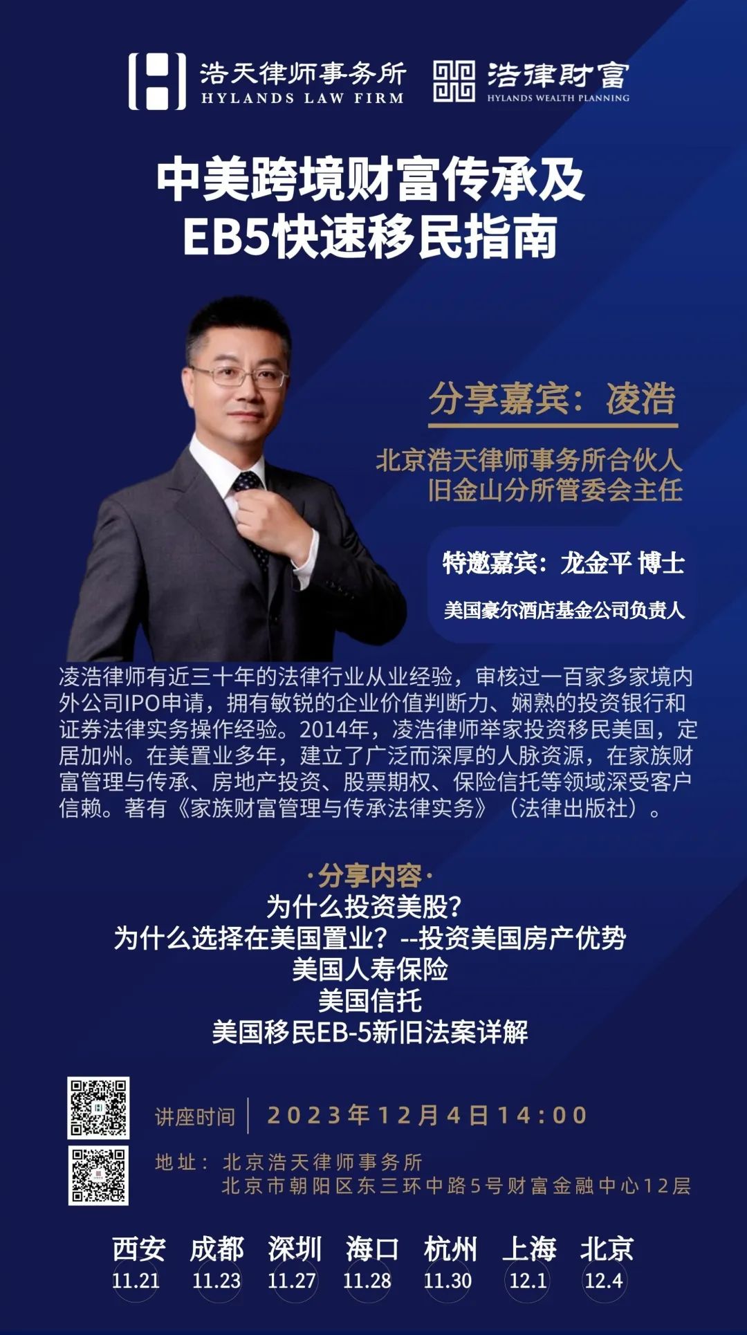 2023年12月4日,凌浩律师作为浩天北京办公室合伙人及浩天旧金山办公室管委会主任,在浩天北京办公室为大家带来了题为《躺“赢”--中美跨境财富传承实务及EB5投资移民快速通道交流会》的专题讲座。