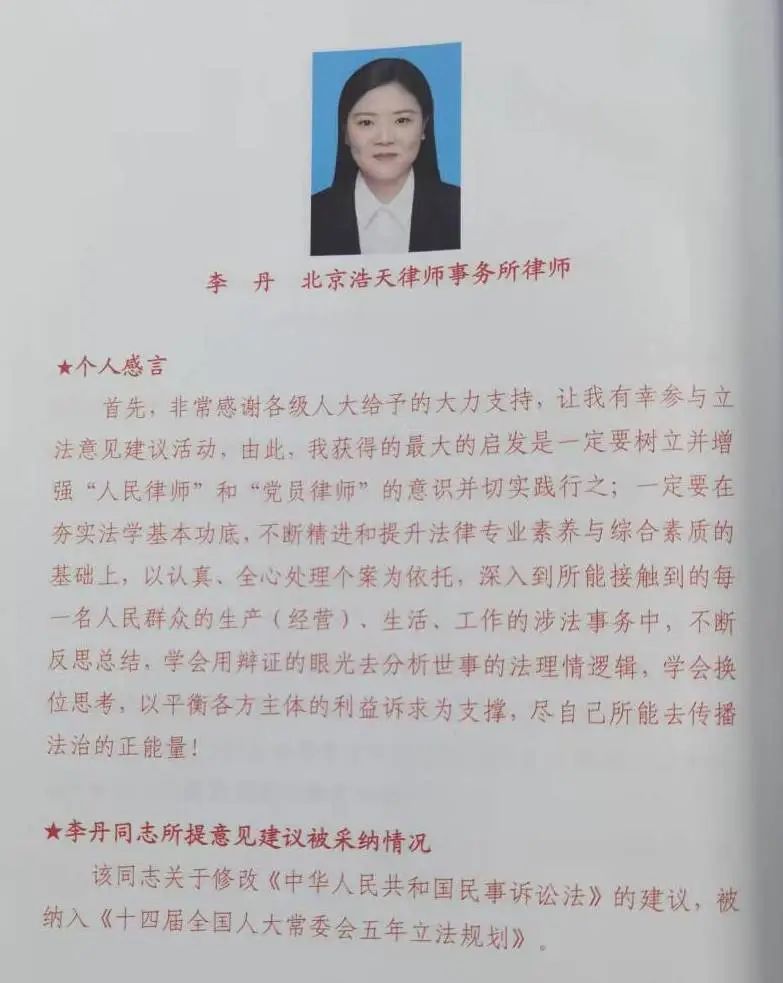 2023年12月5日,全国人大常委会法工委朝阳区人大常委会基层立法联系点工作会议召开。会上为立法意见获得采纳的个人代表和单位代表颁发了立法意见采纳证书。北京浩天律师事务所合伙人姜山赫律师团队李丹律师提出的关于《中华人民共和国民事诉讼法》修改的立法建议被采纳。