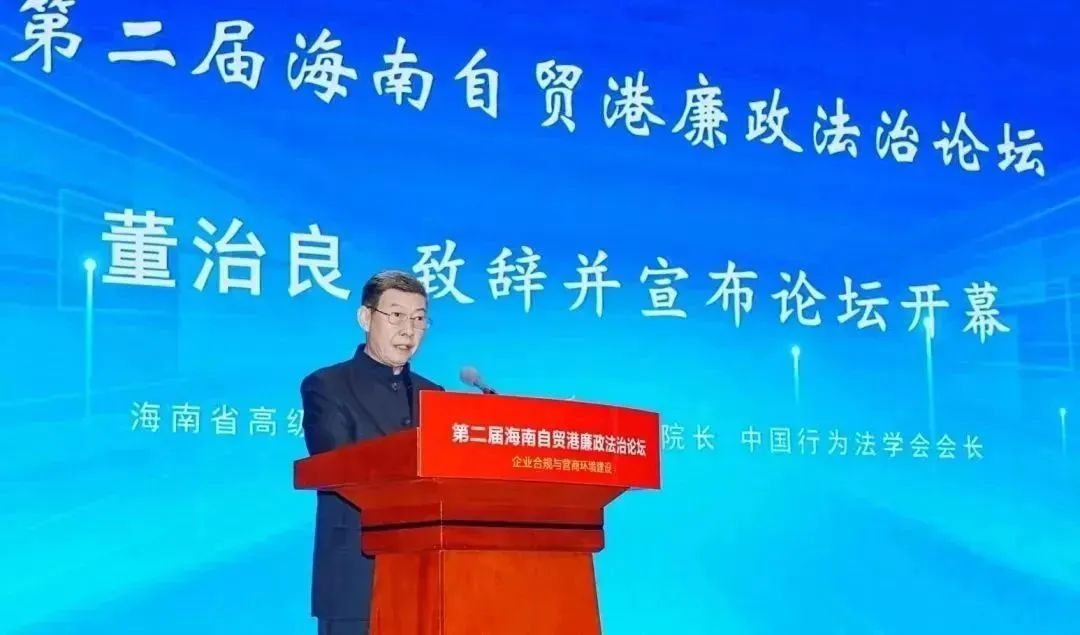 海南省高级人民法院原党组书记、院长、中国行为法学会会长董治良致辞并宣布论坛开幕。他指出,营造法治化、国际化、便利化的营商环境和公平开放统一高效的市场环境,是党中央交给海南的一项重要政治任务,是海南自贸港建设高质量发展的重要基础。本次论坛主题鲜明、内容充实,议程紧凑、成果显著,从海南发展实际出发,以“全面从严治党引领企业合规与营商环境建设”这一命题,共同探讨海南自贸港廉政法治建设的实践经验和理论问题,是以实际工作成效推动全党全社会学习宣传贯彻党的二十大精神的一次具体行动,更是深入学习贯彻落实总书记视察海南时重要指示精神的一场学术研讨。