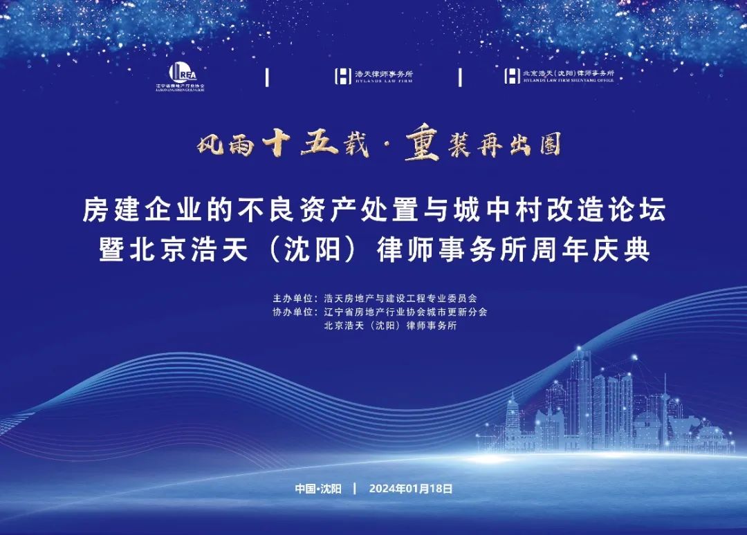 2024年1月18日,房建企业的不良资产处置与城中村改造论坛暨北京浩天(沈阳)律师事务所周年庆典在浩天沈阳办公室成功举办。本次论坛由浩天全国房地产与建设工程专业委员会主办,北京浩天(沈阳)律师事务所、辽宁省房地产行业协会城市更新分会承办,浩天全国各地办公室主任、合伙人以及房建领域协会、企业、专家代表参加了本次论坛。