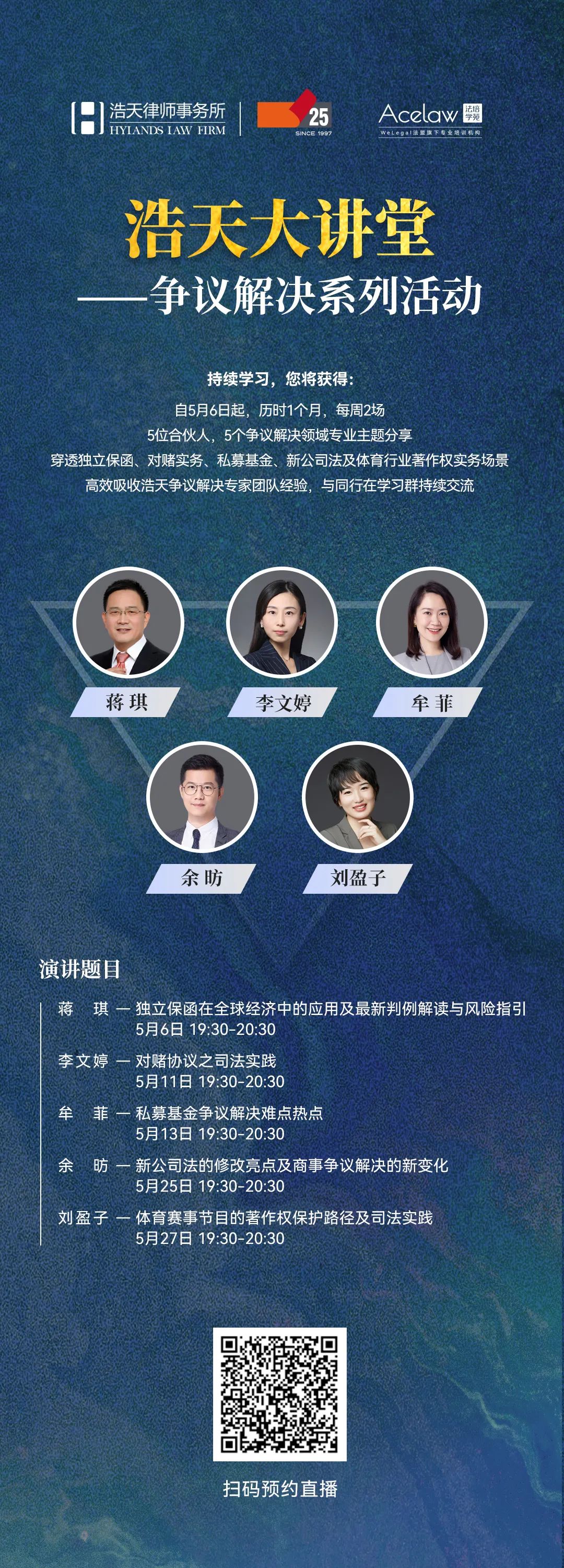 自5月6日起,浩天率先推出“争议解决”专题线上研讨会,将联合5位行业顶级大咖立足行业领域,以实务操作、案例解析为核心,历时一个月,带来5场线上精彩分享,敬请期待!