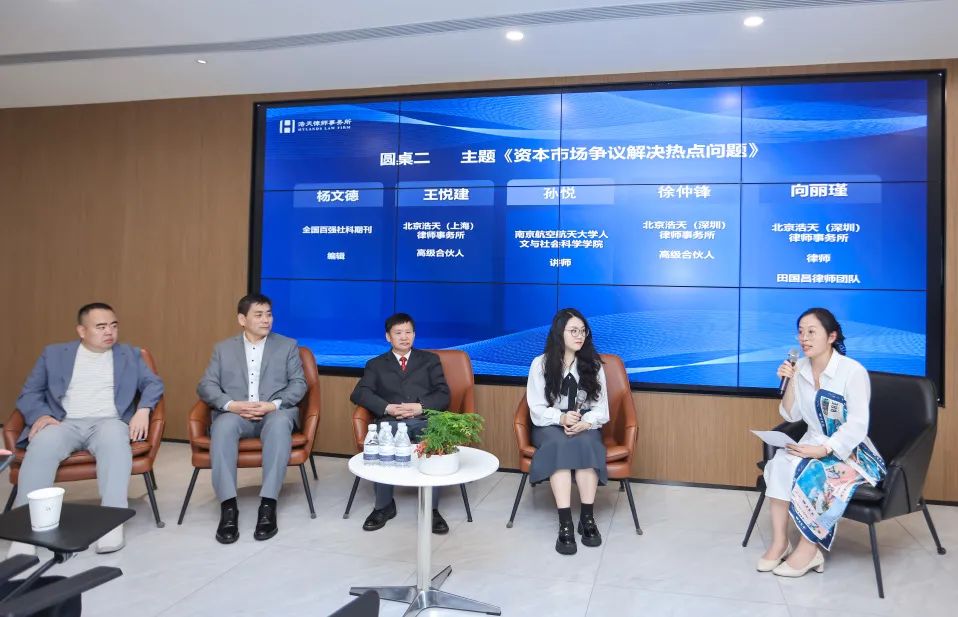 第二场圆桌会议主题为“资本市场争议解决热点问题”。由南京航空航天大学人文社科学院孙悦讲师主持,与谈人为全国百强社科期刊编辑杨文德博士,北京浩天(深圳)律师事务所高级合伙人、公司业务专业委员会主任徐仲锋律师,浩天全国公司业务专业委员会牵头合伙人、北京浩天(上海)律师事务所高级合伙人王悦建律师,浩天深圳办公室向丽瑾律师。与谈人从资本市场最新争议案例与立法由浅入深分析,认为资本市场律师应以企业客户服务为中心,柔性化解企业法律难题的观点,彰显了浩天资本市场律师的智慧。