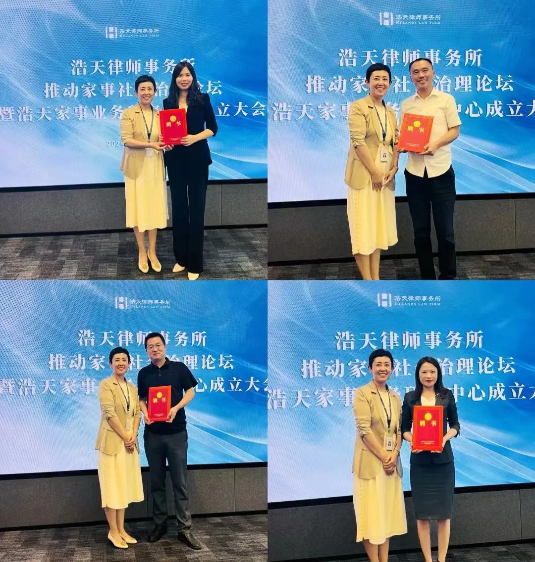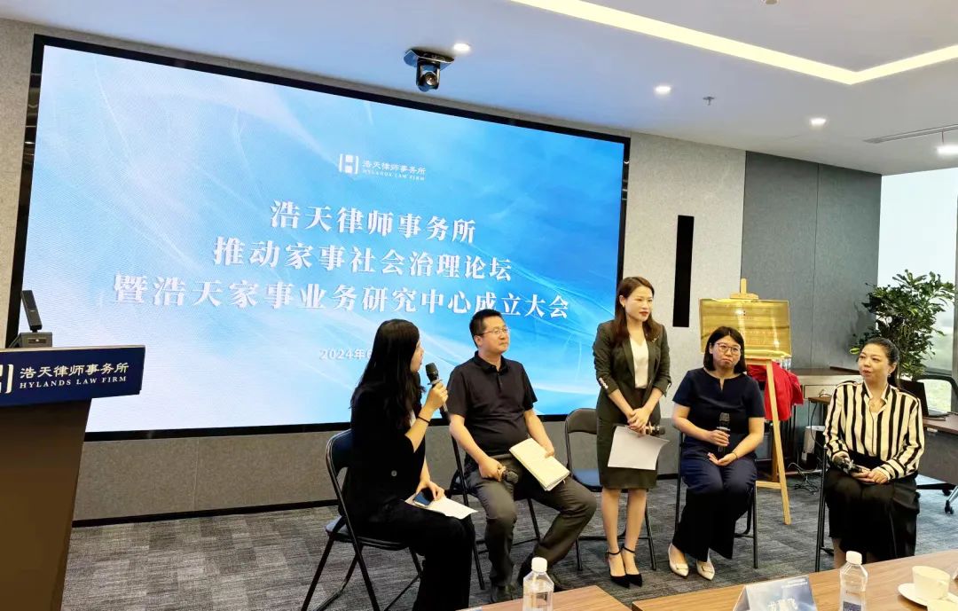 2024年6月28日下午2点,北京浩天律师事务所“推动家事社会治理暨浩天家事业务研究中心成立大会”成功举办,此次活动吸引了所内外律师、咨询公司、媒体及金融机构从业人员共50余人的参加。此次“推动家事社会治理暨浩天家事业务研究中心成立大会”由浩天律师事务所家族财富管理与传承行业委员会主办,活动邀请了四位在业界久负盛名的专家学者共话家事。他们分别是:中国法学会婚姻法家庭法研究会常务副会长、北京市法学会民商法研究会会长、中国人民大学婚姻家庭法研究所执行所长龙翼飞教授;华东政法大学财富管理研究中心副主任、连续12年钱伯斯亚太地区私人客户/财富管理推荐律师、中伦(上海)律师事务所合伙人贾明军律师;全国律协婚姻家庭法专业委员会副主任、天津律协婚姻家事专业委员会主任、天津优法律师事务所执行主任姚丹律师;中国婚姻法学会理事、西南政法大学婚姻家事与财富传承研究中心主任、浩天重庆办公室律师李俊副教授。