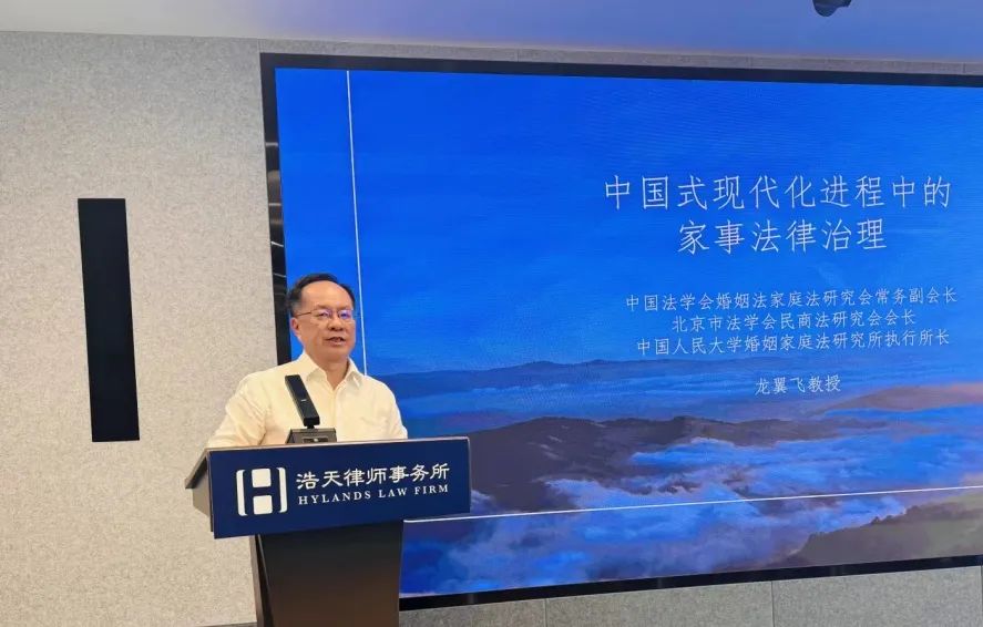 龙翼飞教授发表了《中国式现代化进程中的家事法律治理》主题演讲,龙教授从《民法典》婚姻家庭编的立法精神讲起,深入阐述了家事法律治理的要义和家事法对社会稳定的影响,同时也对浩天家事业务研究中心的发展寄予厚望。他希望浩天家事业务研究中心不仅在业务上要引领前沿,还要有公益心有担当。