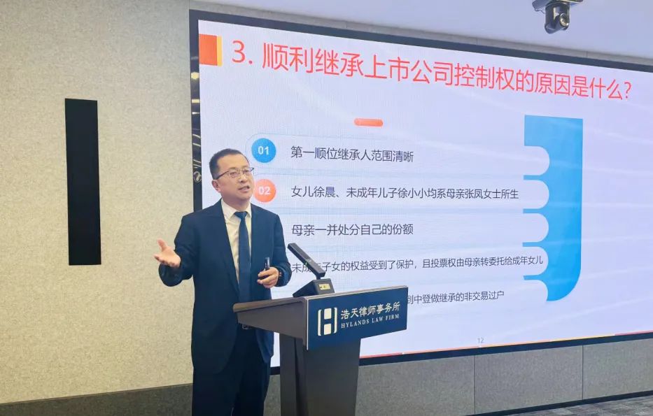 贾明军律师发表了《家事纠纷对民营企业稳定发展的推动与影响》主题演讲。贾律师从某上市公司股权传承的成功案例出发,剖析了上市公司实控人的继承人顺利完成股权传承的原因,探讨了家事律师在上市公司实控人家族业务的细分类型,给与会律师非常大的启发。