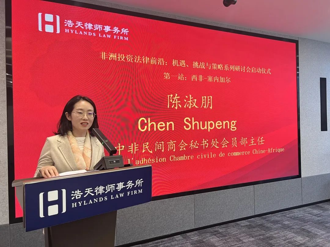 中非民间商会秘书处会员部陈淑朋主任从商会的角度,通过四个方面来跟大家分享中国企业对非投资的基本的情况。强调了律所在促进中非合作中的重要作用。她指出:“中国企业在非洲的投资不断增加,特别是在基础设施、制造业、物流园区等领域。中非民间商会今后计划与律所、研究机构和使领馆加强合作,以促进更多的交流和合作。”