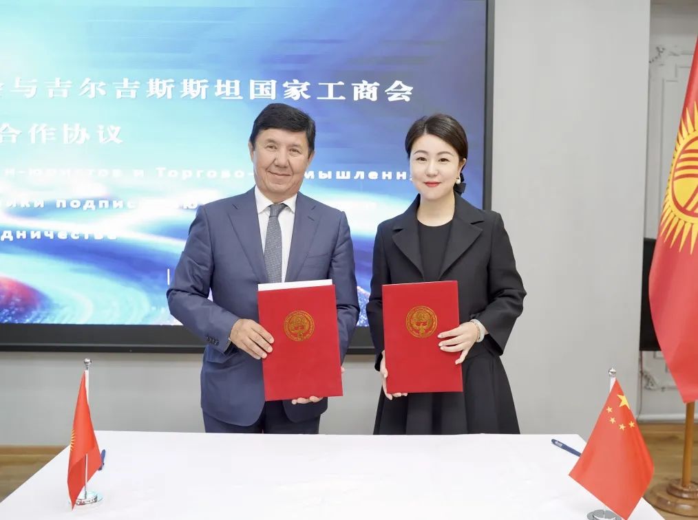 萨利耶夫主席和刘洁会长分别代表吉尔吉斯斯坦国家工商会与陕西省女法律工作者协会签订《法律合作框架协议》,该协议的签订,将进一步为中吉两国的经贸往来提供更好的法律服务。