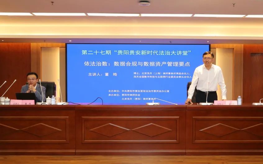 中共贵阳市委依法治市办举办的第二十七期“贵阳贵安新时代法治大讲堂”由贵阳市律师协会与北京浩天(贵阳)律师事务所联合承办,于7月17日在贵阳市行政复议中心进行。讲座由市委依法治市办常务副主任、市司法局局长张明勇主持并致辞,北京浩天律师事务所全国数字科技与互联网行业委员会牵头合伙人、浩天上海办公室高级合伙人董皓博士主讲,贵阳贵安有关单位、有关企业及律师代表共计160余人参加。