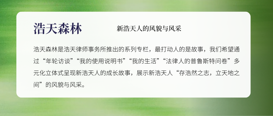 浩天森林是浩天律师事务所推出的系列专栏,最打动人的是故事,我们希望通过“年轮访谈”“我的使用说明书”“我的生活”“法律人的普鲁斯特问卷”的多元化立体式呈现新浩天人的成长故事,展示新浩天人“存浩然之志,立天地之间”的风貌与风采。