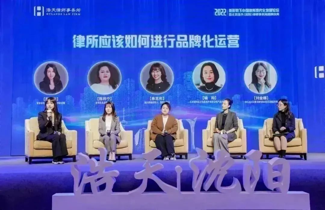 沙龙由北京浩天律师事务所管委会委员朱志彤律师主持,智合合伙人、咨询部副总裁聂佳彤、金律良言品牌创始人陈祎宁、北京威科亚太信息技术有限公司产品内容总监喻阳、WeLegal法盟法律与政府关系高级经理刘金娜参加主题沙龙讨论。朱律师和四位嘉宾共同探讨了律所转变管理思维重视品牌化运营的原因,介绍了律所内部管理应做好哪些品牌运营工作,分析了如何与外部平台合作实现品牌运营目的,以及未来律所品牌运营的方向与趋势等话题。场上嘉宾观点亮眼,金句频出,主持人点评精彩,场下观众积极互动,氛围热烈,整场庆典达到高潮。