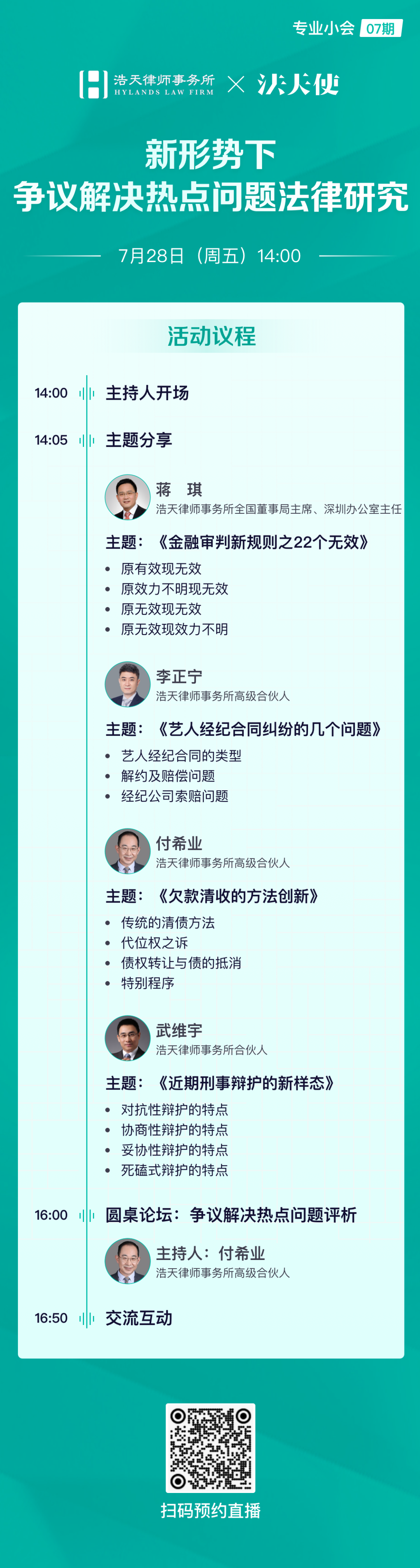 7月28日(周五)14:00,浩天律师事务所全国董事局主席、深圳办公室主任蒋琪律师,高级合伙人李正宁律师、付希业律师,以及合伙人武维宇律师,将通过法天使「专业小会」直播分享《新形势下争议解决热点问题法律研究》。几位嘉宾将分别就《金融审判新规则之22个无效》、《艺人经纪合同纠纷的几个问题》、《欠款清收的方法创新》、《近期刑事辩护的新样态》进行主题分享。