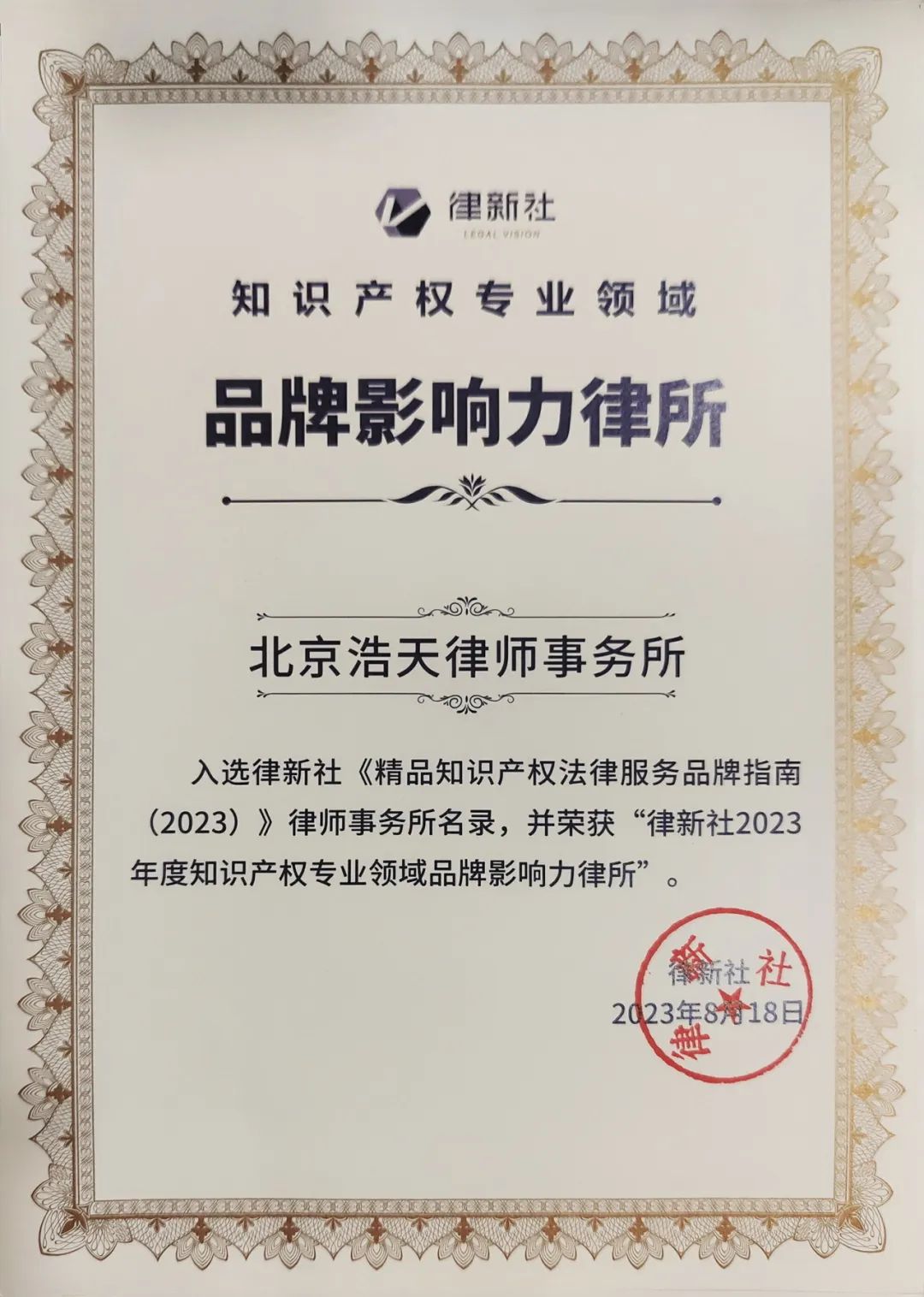 近日,由上海交通大学知识产权与竞争法研究院、徐汇律工委、律新社主办的“知同道合 智汇未来”第八届徐汇滨江法治论坛在上海成功举办。论坛重磅发布了《精品知识产权法律服务品牌指南(2023)》(以下简称"《指南》"),并颁发了“品牌影响力律所”及“品牌之星”荣誉律师大奖。凭借在知识产权领域的卓越表现和客户的良好口碑,浩天律师事务所荣膺2023律新社知识产权专业领域“品牌影响力律所”并入选《指南》律所名录;浩天律师事务所合伙人朱玉子律师荣获2023年度律新社知识产权专业领域“品牌之星”律师并入选《指南》律师名录。