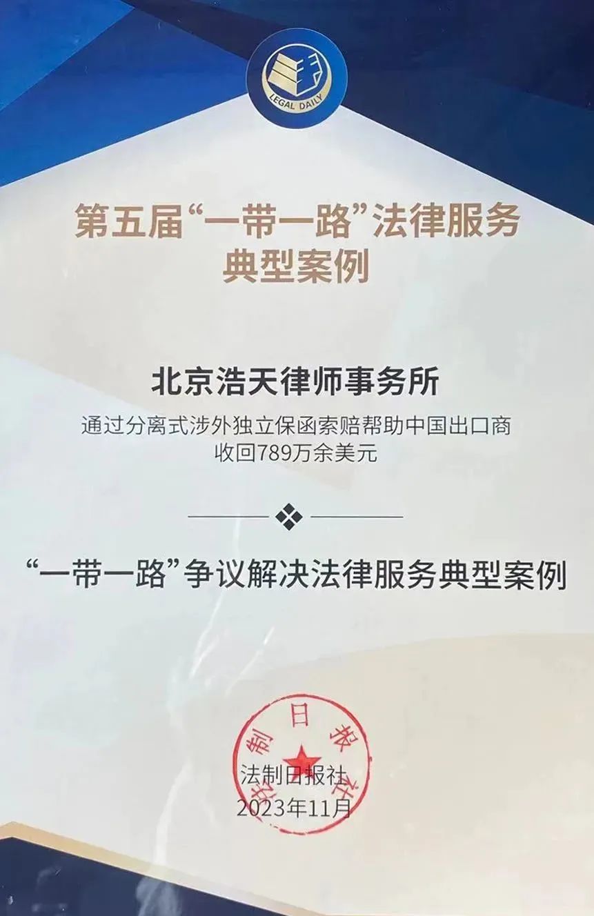 由浩天蒋琪律师和杨东勤律师承办的独立保函索赔案荣获本届“一带一路”十大争议解决法律服务典型案例奖。在该案中,中国出口商同法国进口商签订了国际货物买卖合同。为了担保法国进口商能够履行国际货物买卖合同项下的付款义务,该进口商的俄罗斯大股东作为委托人指示瑞士信贷银行开立了以法国进口商为申请人、以中国出口商为受益人、中国银行为通知行的付款保函。在基础交易合同履行过程中,法国进口商经营状况不断恶化,不能按照合同约定支付货款。在保函索赔过程中,法国进口商又因资不抵债而被法国法院裁定进入破产程序。接受委托后,在同客户充分沟通后,考虑到了客户的商业目标、风险防范和利益保护需求,浩天律师为客户制定了分批次提交索赔文件的整体方案和策略。通过中国出口商业务部、法律事务及风险控制部、浩天律师的完美配合和共同努力,中国出口商向瑞士信贷银行成功地索赔了独立保函项下的款项,收回了789万余美元的货款。该案中的涉外保函索赔案涉及的当事人分布在中国、法国、瑞士和俄罗斯四个国家,不仅涉及到了保函索赔问题,还涉及到分离式保函问题和保函申请人破产问题。
