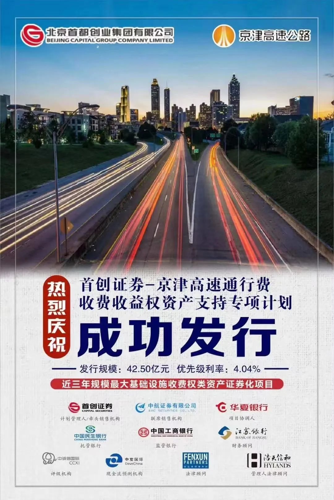 该计划于2020年10月16日在上海证券交易所成功发行,系近三年规模最大的基础设施收费权类资产证券化项目,目标募集总规模为人民币42.5亿元。该计划发行人为天津京津高速公路有限公司,产品底层资产为基础设施收费权,由首创证券股份有限公司担任计划管理人。中诚信国际信用评级有限责任公司给予优先级资产支持证券评级为AAA级。