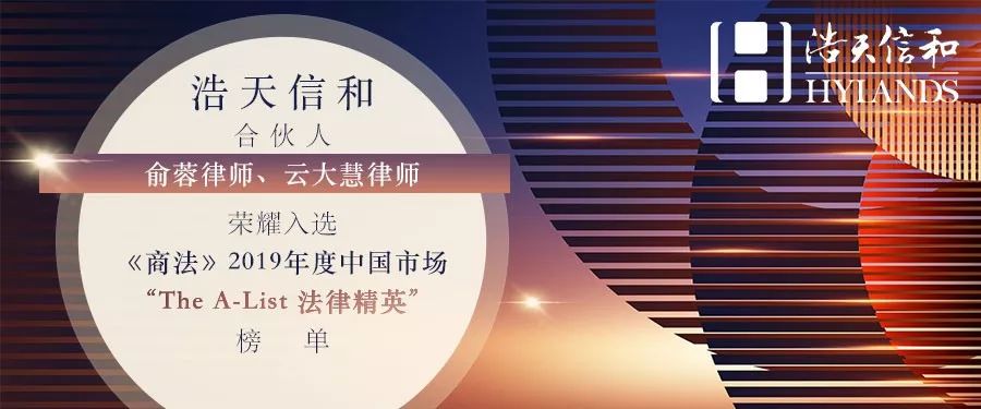 2019年12月,《商法》(China Business Law Journal) 2019年度中国市场“The A-List 法律精英”(The A-List 2019)榜单正式发布,浩天信和律师事务所合伙人俞蓉律师、云大慧律师凭借深厚的法律底蕴、突出的专业能力和广受赞誉的客户服务荣耀入选榜单。