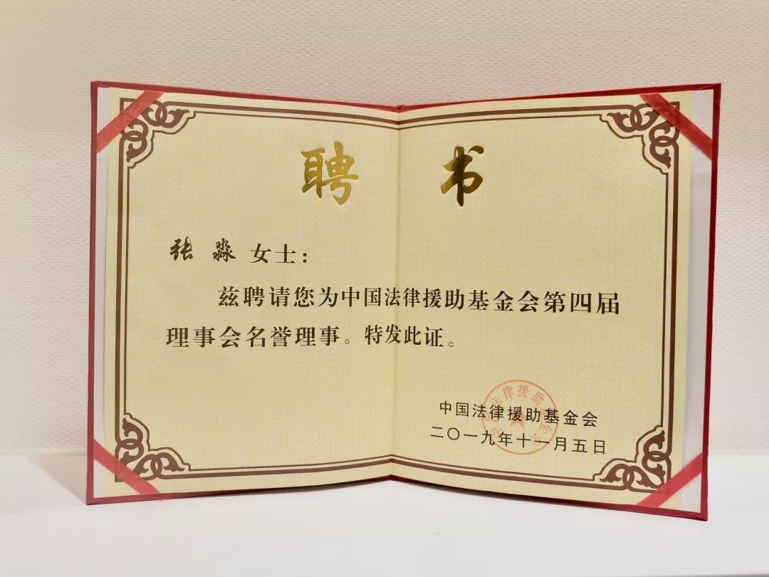 2019年11月20日,中国法律援助基金会第四届理事会名誉理事聘任仪式在京举行,浩天信和合伙人张淼律师受邀担任中国法律援助基金会第四届理事会名誉理事。