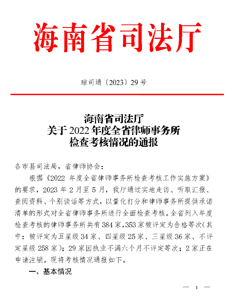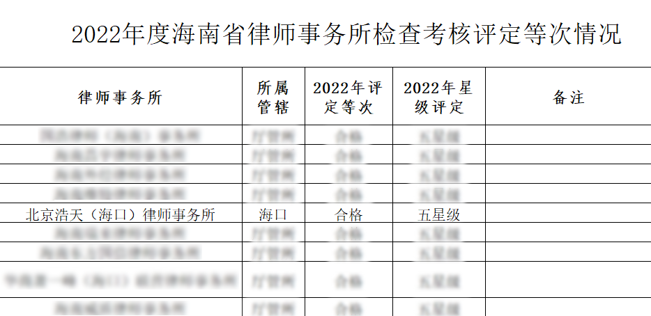 近日,海南省司法厅印发《2022年度全省律师事务所检查考核情况的通报》(琼司通〔2023〕 29号),北京浩天 (海口) 律师事务所获评海南省五星级律所。这是浩天海口办公室自2020年以来连续三年荣膺“五星级”律所称号。