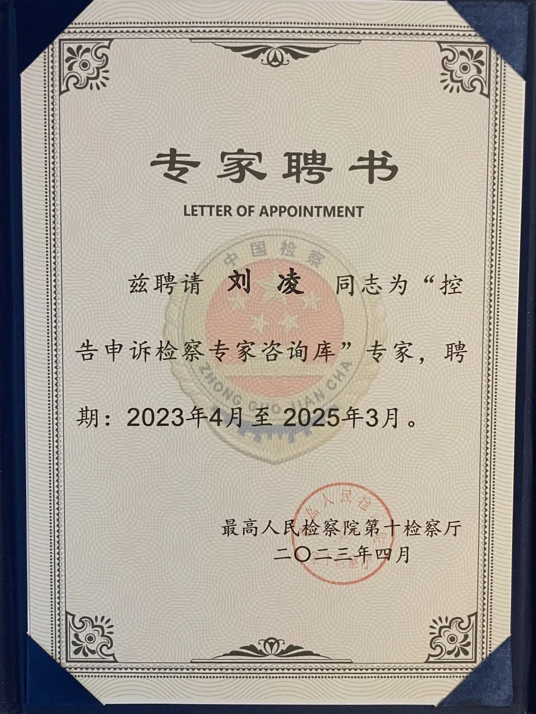 浩天刘凌律师受聘为最高人民检察院“控告申诉检察专家咨询库”专家
