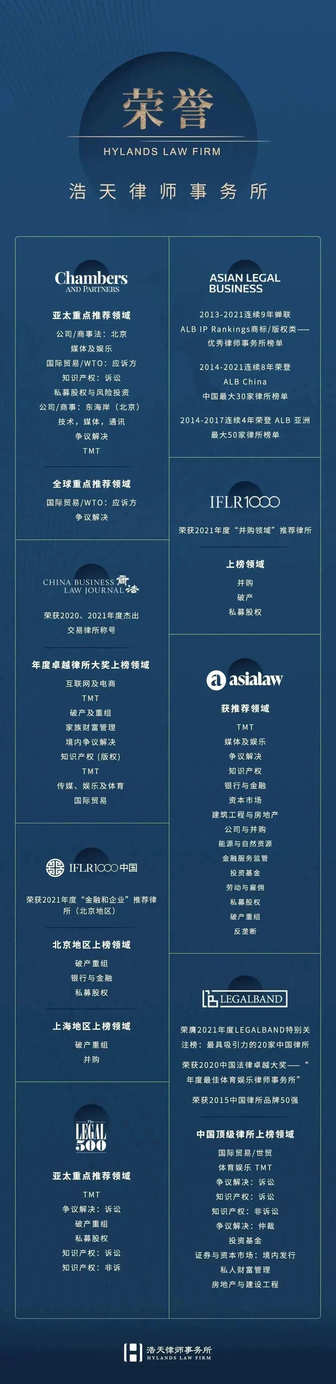 《国际金融法律评论》(IFLR1000)是金融领域国际知名法律媒体,于1990年开始发行。每年对全球超过120个法域的律所和律师进行调研和排名,并发布金融和公司业务领域的榜单。《国际金融法律评论》在业界有相当高的权威性和广泛的影响力,旨在为客户提供简便易查的排名和律所简介,并对市场走向和商业环境提供前瞻分析。