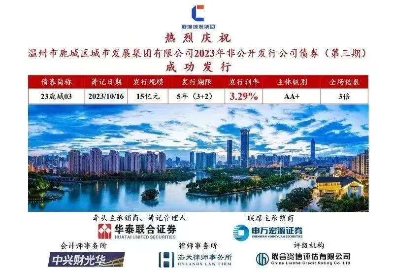 浩天助力温州市鹿城区城市发展集团有限公司2023年非公开发行公司债券(第三期)发行成功