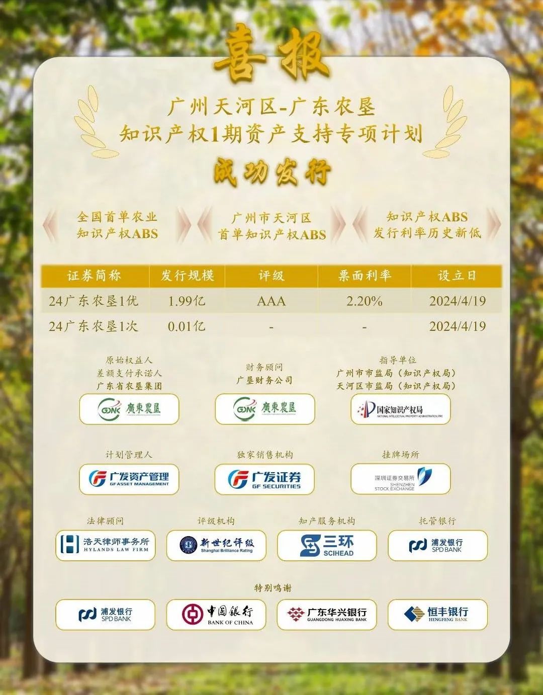 浩天助力广州天河区-广东农垦知识产权1期资产支持专项计划成功发行