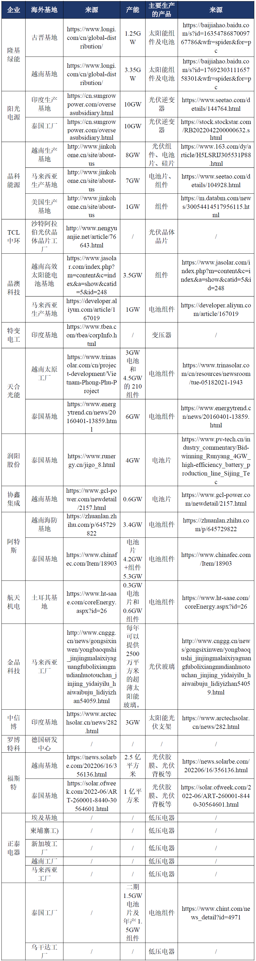 面对各国针对我国光伏产品层出不穷的关税政策,在海外投资建厂似乎成了国内光伏行业不得不的选择,光伏头部生产企业开始在多个国家同时布局以为出口获得保障。截止到2022年末,中国光伏企业在海外的生产基地如下 :