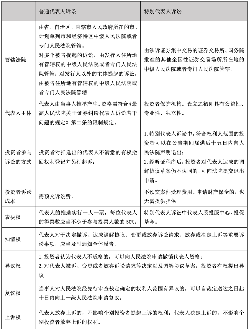 其中,特别代表人诉讼最大的特点是借鉴吸收美国的“默示加入、明示退出”制度,较好的解决了普通代表人诉讼难以聚沙成塔的集体行动难题。[15]同时,加入投保机构作为“发动主体”突出其作为诉讼代表人的专业优势。相较于普通代表人诉讼,投保机构这类具有公益性质的专业机构直接或间接影响诉讼活动,有利于平衡诉辩双方力量。并且,新《证券法》在增设特别代表人诉讼的同时,并没有完全废弃普通代表人诉讼程序,而是选择保留普通代表人诉讼作为特别代表人诉讼的前置程序。这主要考虑到相较于特别代表人诉讼,普通代表人诉讼最终确定的维权规模以及案件影响力都相对可控,节约诉讼成本。[16]