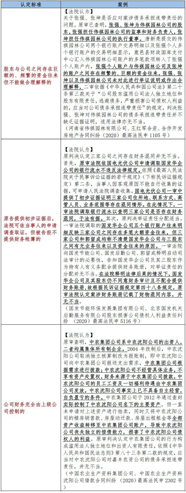 通过最高院的裁判实例也可以看到财务混同的一般认定标准: