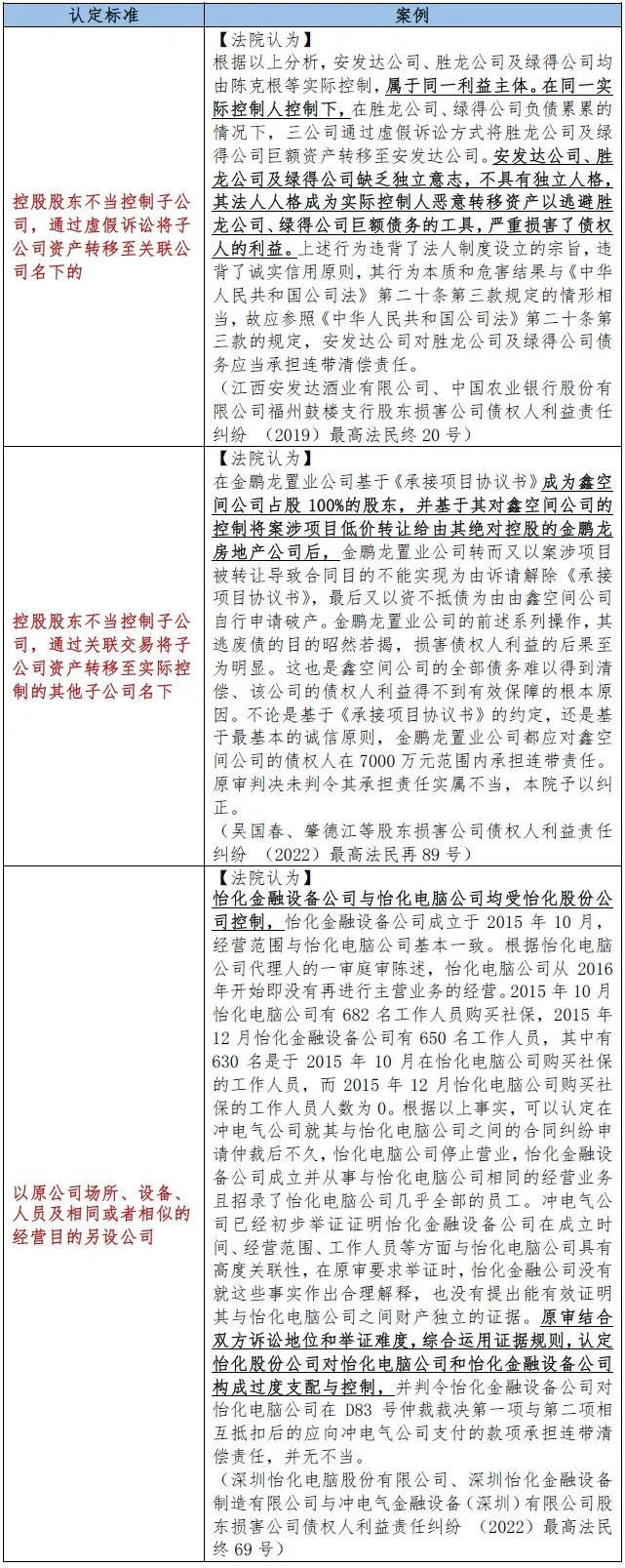 《九民会议纪要》第十一条规定:“公司控制股东对公司过度支配与控制,操纵公司的决策过程,使公司完全丧失独立性,沦为控制股东的工具或躯壳,严重损害公司债权人利益,应当否认公司人格,由滥用控制权的股东对公司债务承担连带责任。”常见情形包括:1、母子公司之间或者子公司之间进行利益输送;2、母子公司或者子公司之间进行交易,收益归一方,损失却由另一方承担;3、从原公司抽走资金,然后再成立经营目的相同或者类似的公司,逃避原公司债务;4、先解散公司,再以原公司场所、设备、人员及相同或者相似的经营目的另设公司,逃避原公司债务;以及“其他情形”这一兜底条款。除此之外,《上海市高级人民法院民事审判第二庭关于审理公司法人人格否认案件的若干意见》第九条对公司进行不正当支配和控制的认定进行了规定,股东利用关联交易,非法隐匿、转移公司财产的,可以认定股东对公司进行不正当支配和控制。