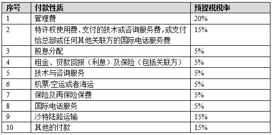 沙特居民企业或非居民企业在沙特的常设机构在对外支付来自沙特境内的款项时都应代扣代缴一定比例的预提税,税率取决于款项的性质,具体如下:
