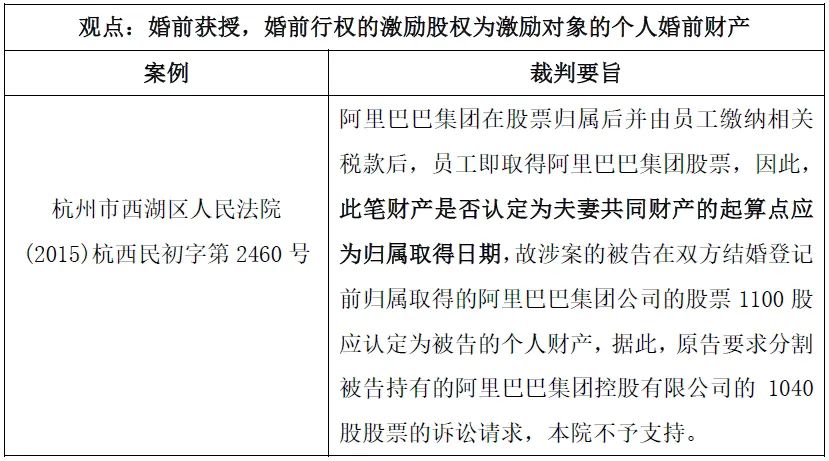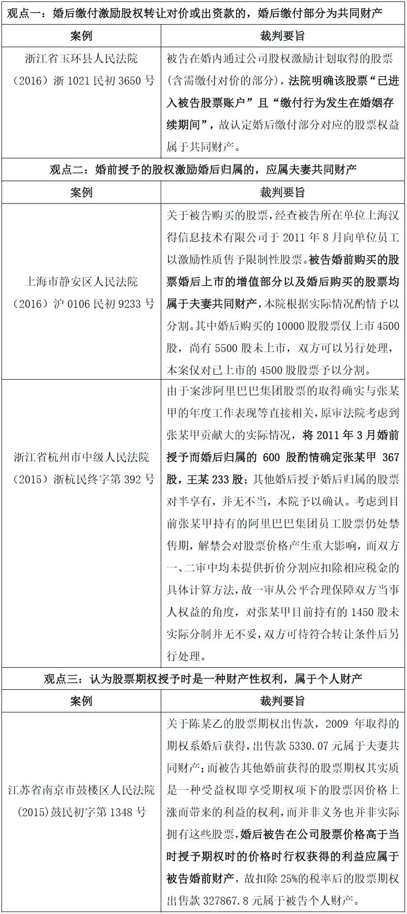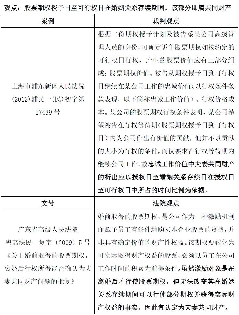 对于该种情形,实践中通常会结合婚姻关系存续期间与授予时间、行权时间是否重合来综合判断是否属于夫妻共同财产。
