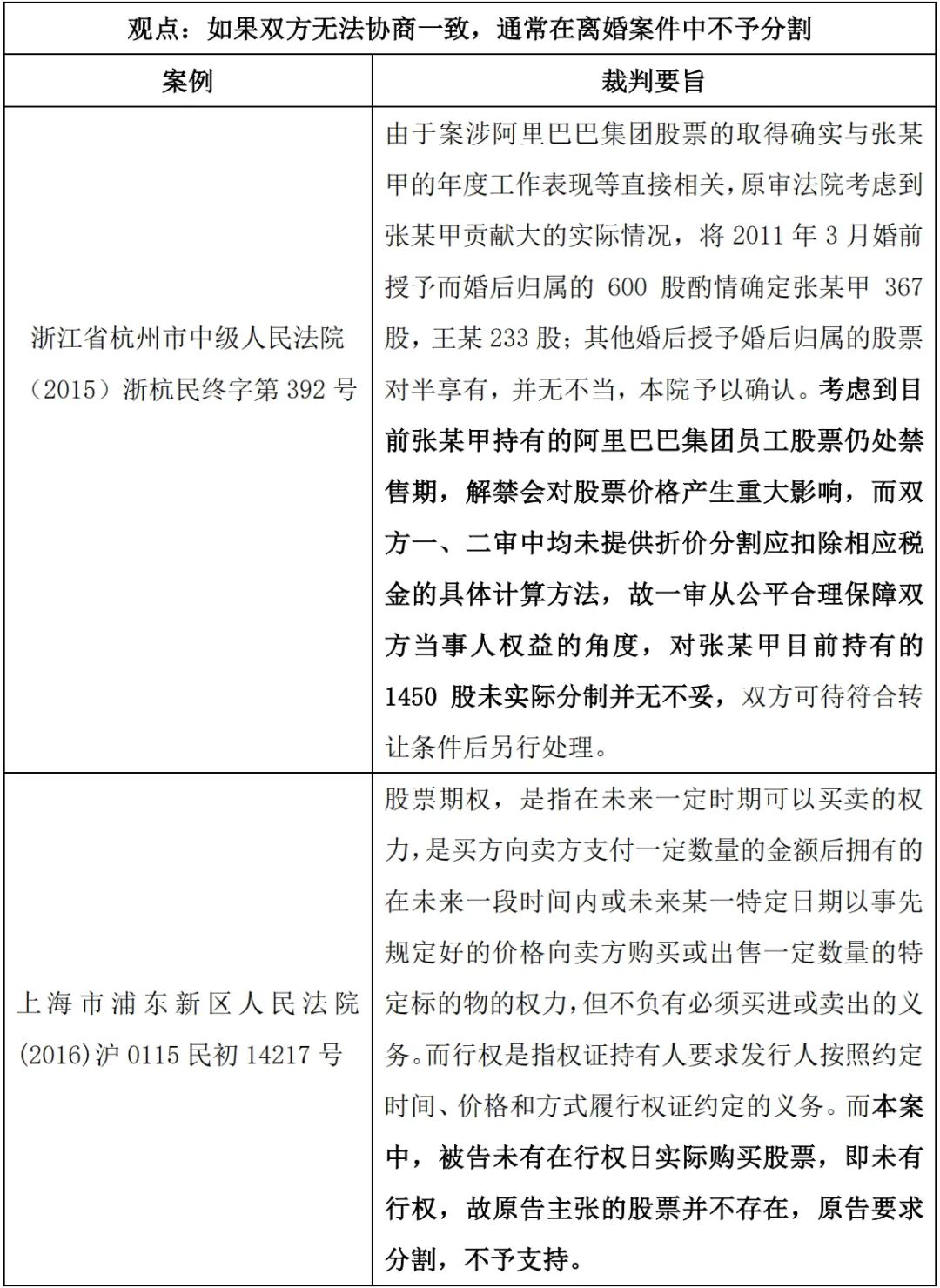 如离婚时双方能协商一致,则可由激励对象向配偶支付相应价款。但如果双方无法协商一致,由于未来是否符合行权条件,以及是否行权、行权价格均存在不确定性,法院通常在离婚案件中不予分割,待行权后再行起诉。