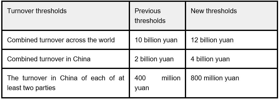 The Provisions of the State Council on Thresholds for Prior Notification of Concentration of Undertakings were revised in January 2024. The relevant turnover thresholds have been raised significantly compared to the previous thresholds.
