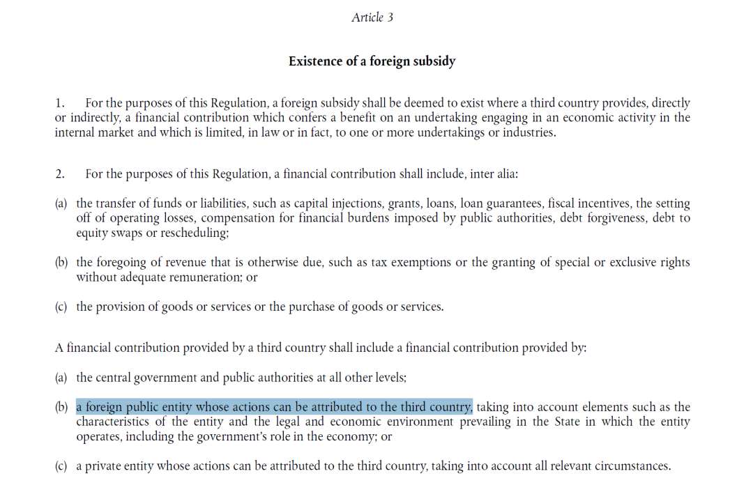 根据《外国补贴条例》第3.2款,欧委会对于补贴来源即“第三国”的定义包含了“行为可归因于第三国的外国公共实体”,其认定需考虑该实体的特性以及该实体运营所在国家普遍存在的法律和经济环境等因素,包括政府在经济中的作用。