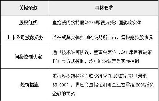法案对企业设置了严苛的股权审查机制,不仅限制持股比例,还通过技术协议、董事会席位等非股权方式认定控制权。企业需谨慎设计股权架构,避免因“受禁外国实体”认定而丧失政策支持。