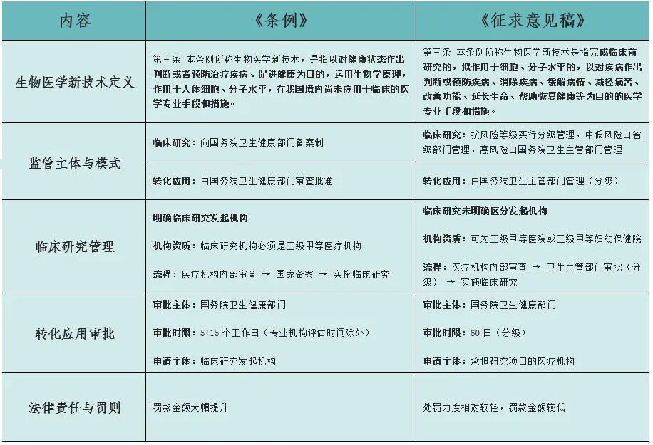 相较于2019年发布的《征求意见稿》,《条例》在生物医学新技术定义、监管主体与模式、转化应用审批、法律责任与罚则等方面有所变动。同时,《条例》还新增优先审查、紧急应用、在线服务系统、受试者随访监测等创新条款。