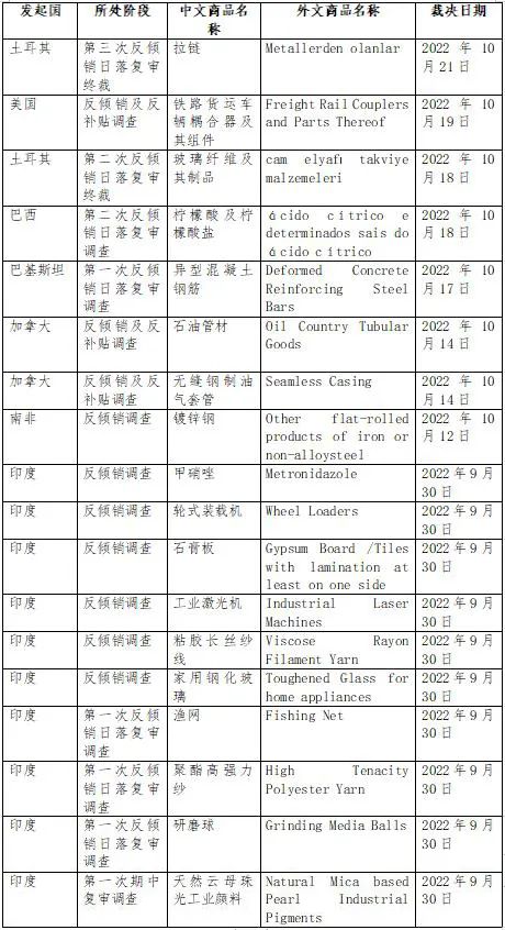 2022年10月贸易救济“出口应诉”动态更新汇总