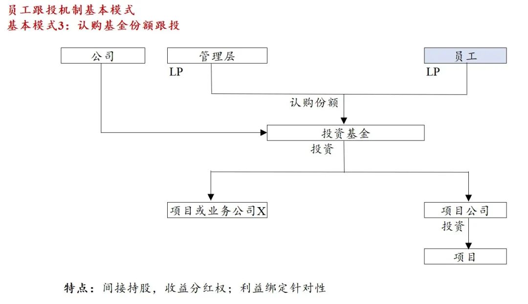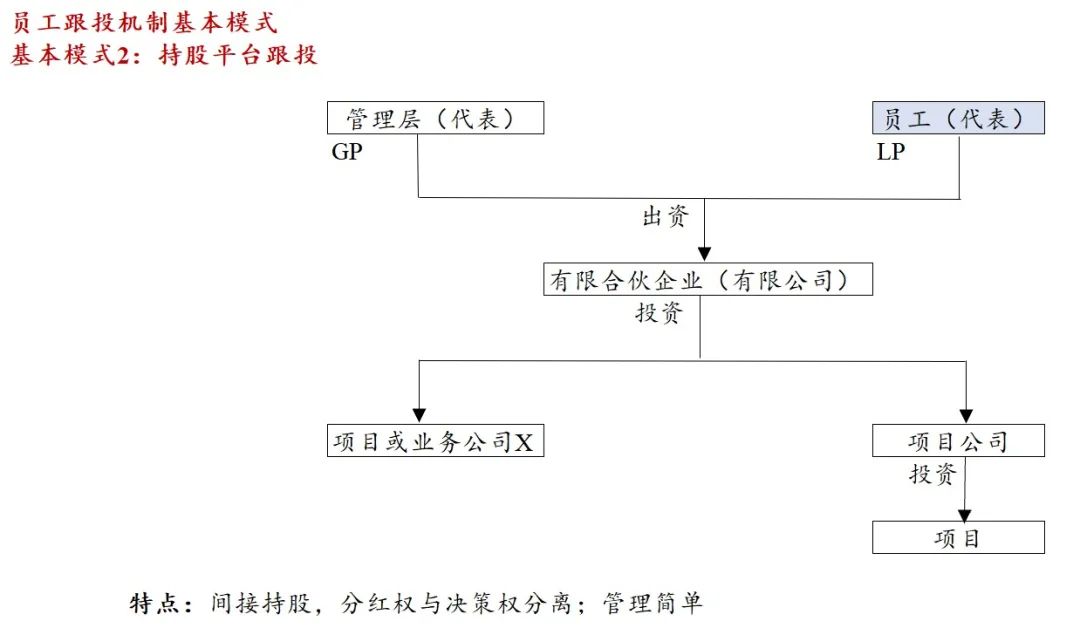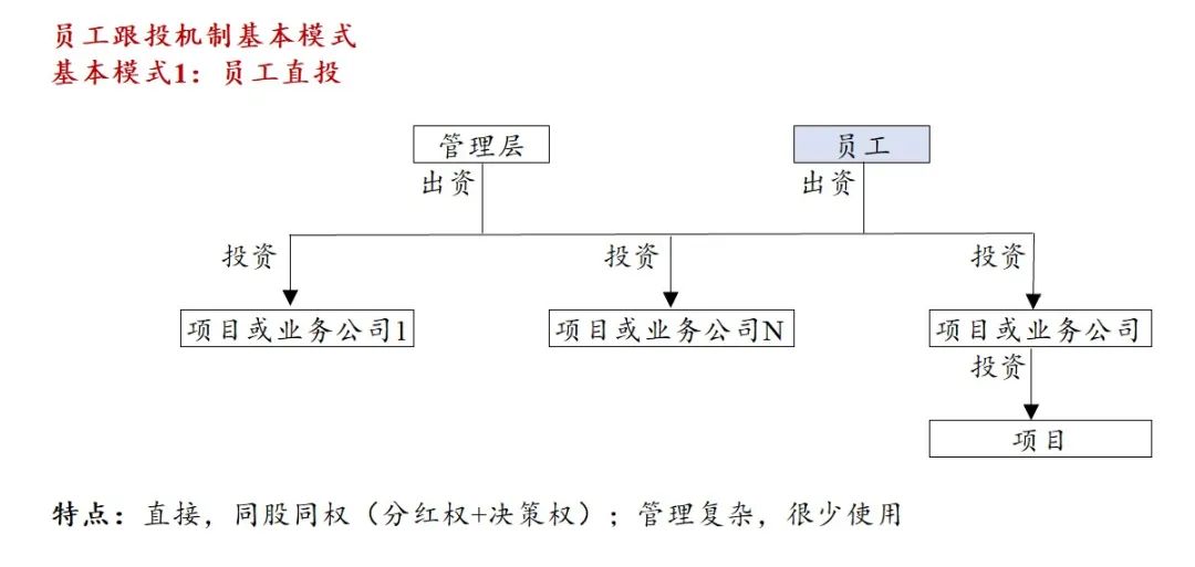 1)员工直投:团队成员以个人名义跟随出资并直接持有目标项目的股权。这种模式最具直接性,奉行“同股、同权、同责、同利”。完全按照所持股权比例共享利益、同担风险,高约束的同时也可达到高激励的效果。但一般对跟投的额度比例会有限制。但这种方式下,跟投员工会直接参与决策,可能增加经营管理难度和决策复杂性,不利于跟投机制管理,目前在实践中的应用比较少。