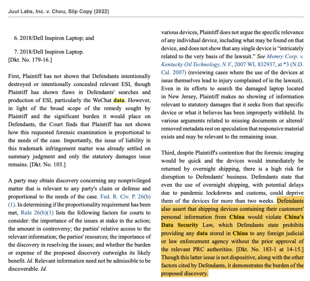 本案中,原告要求对被告若干位于中国的电子设备进行取证检查。被告争辩说,中国《数据安全法》禁止其在未经政府批准的情况下将从中国运输包含客户个人信息的设备运出中国。美国法院认为:虽然中国《数据安全法》问题不是决定性的,但结合被告引用的其他因素,足以限制这一取证申请给被告造成的负担。美国法院未对中国《数据安全法》展开分析,但支持了被告的抗辩。案例内中国《数据安全法》参考条款第三十六条规定:“中华人民共和国主管机关根据有关法律和中华人民共和国缔结或者参加的国际条约、协定,或者按照平等互惠原则,处理外国司法或者执法机构关于提供数据的请求。非经中华人民共和国主管机关批准,境内的组织、个人不得向外国司法或者执法机构提供存储于中华人民共和国境内的数据。”