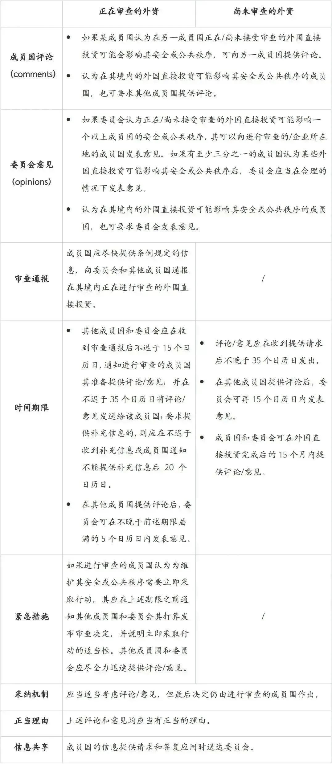 3. 关于合作机制。《欧盟外商投资审查条例》对 3 种不同情形的外国直接投资下的审查合作机制进行了规定,这 3 种情形分别是:正在审查的外国直接投资,尚未审查的外国直接投资,以及可能影响涉及到欧盟利益的计划或项目的外国直接投资。