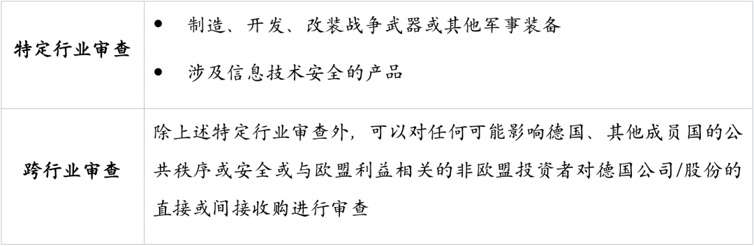2)审查范围。德国政府对外商投资的审查包括特定行业审查(Sector-specific assessment)和跨行业审查(Cross-sectoral assessment),具体表现为:
