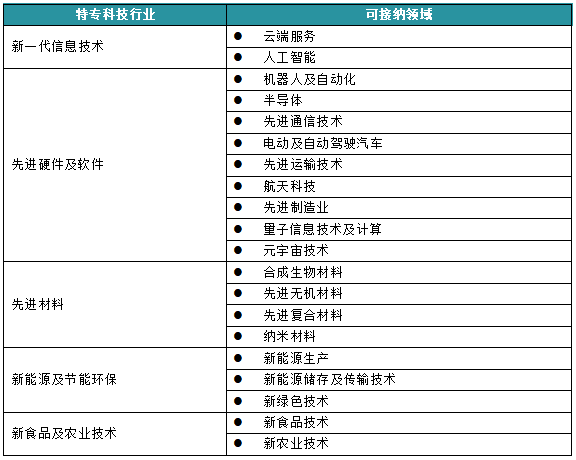 判断一公司是否属于上市制度的“特专科技公司”,其是否主要从事特专科技行业可接纳领域尤为重要。联交所附随发布的《有关特专科技公司的指引信》(以下简称“《指引信》”)中对于时下联交所认为的“特专科技行业”及其中的“可接纳领域”进行了详尽描述,具体分类如下: