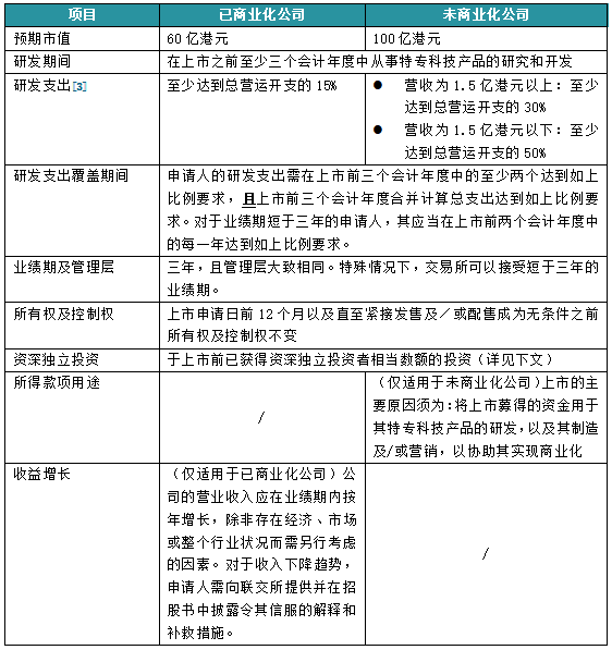 联交所基于上述分类,为已商业化公司和未商业化公司制定了不同的上市条件,未商业化公司由于其存在较高的投资风险,上市条件更为严苛。具体如下: